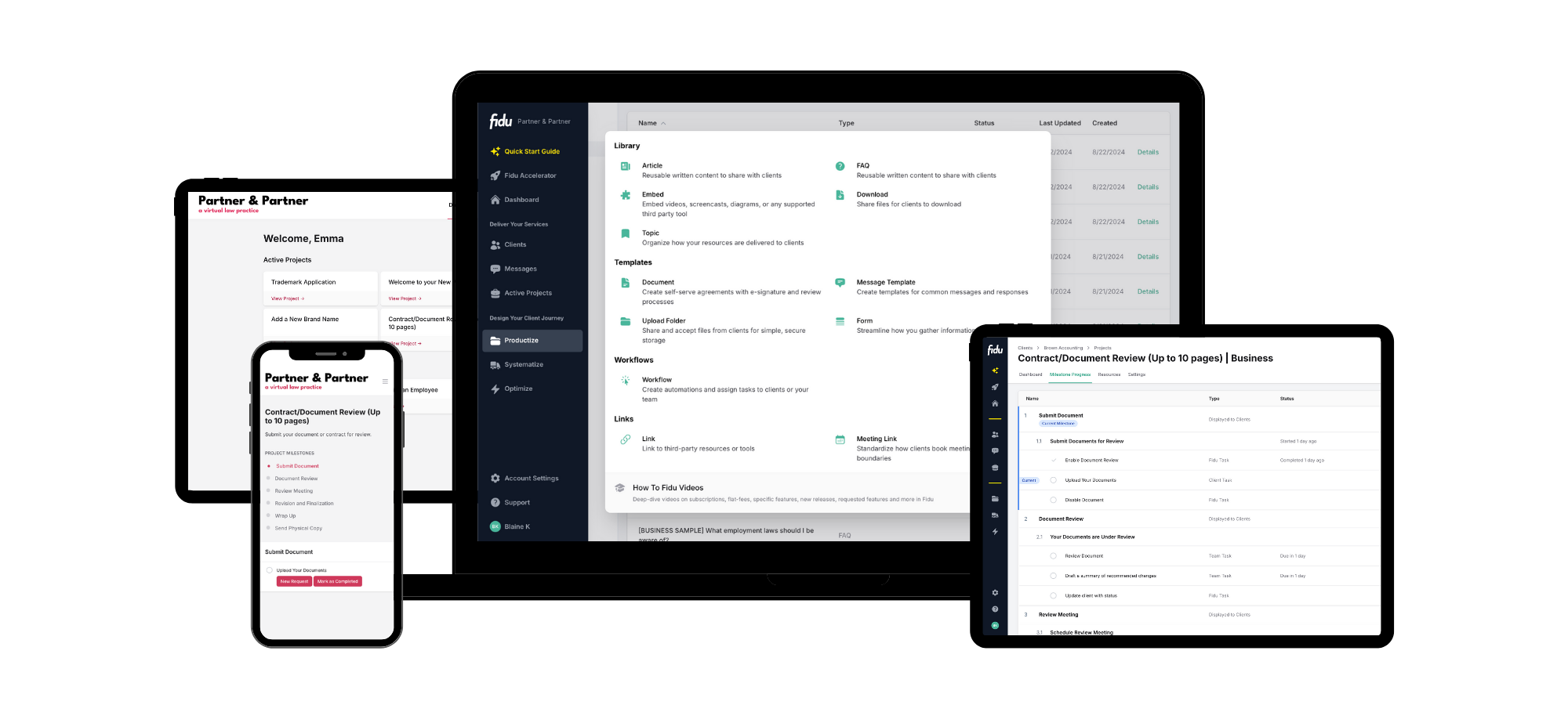 Fidu replaces the traditional client portal with a platform specifically designed to power the delivery of your subscription and flat fee legal services.